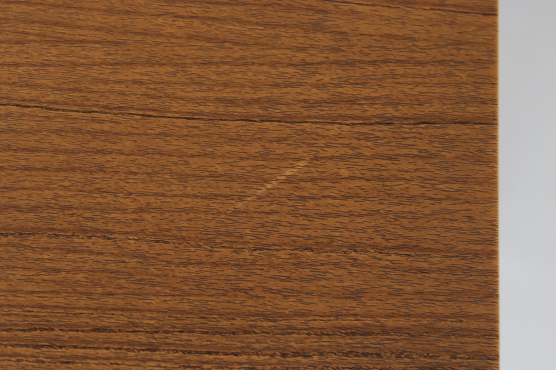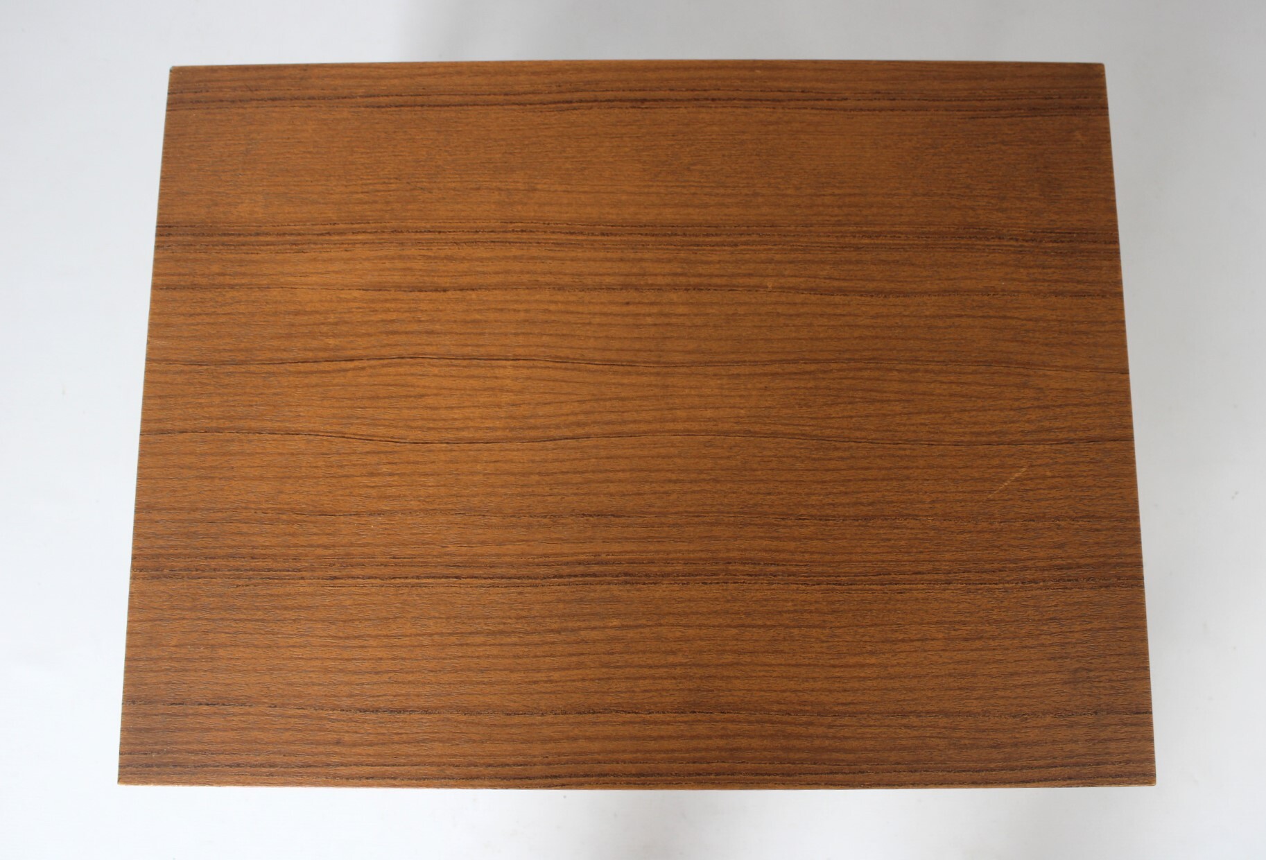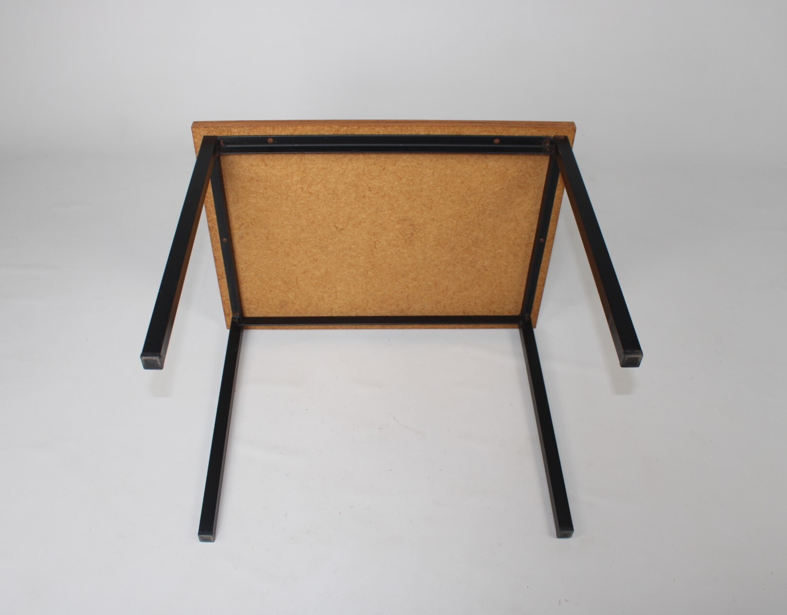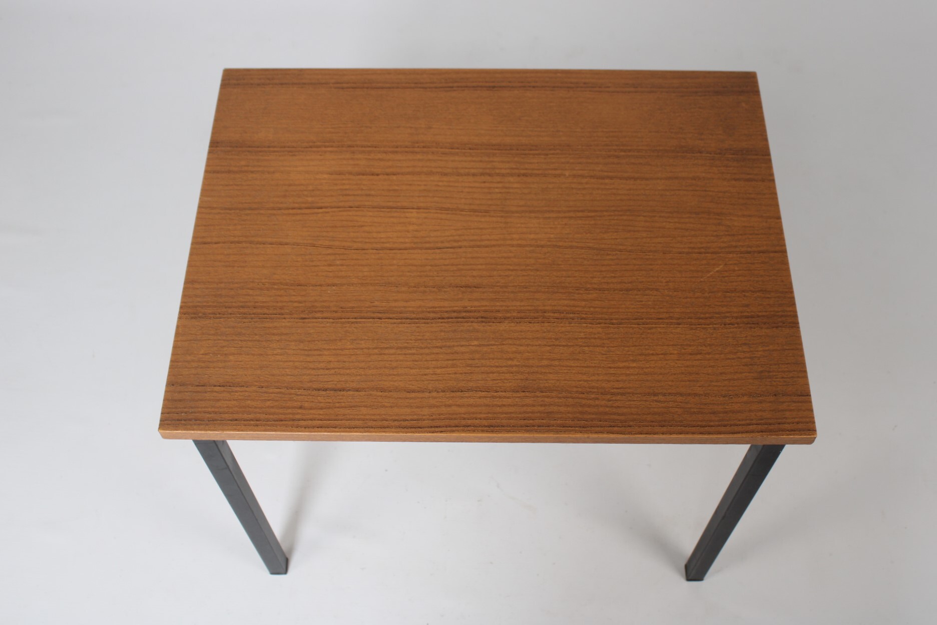 Een klein vintage tafeltje met een afwerking in bruin imitatiehout. Zwarte metalen pootjes.