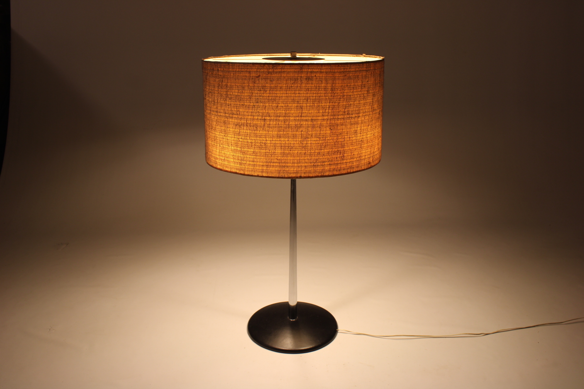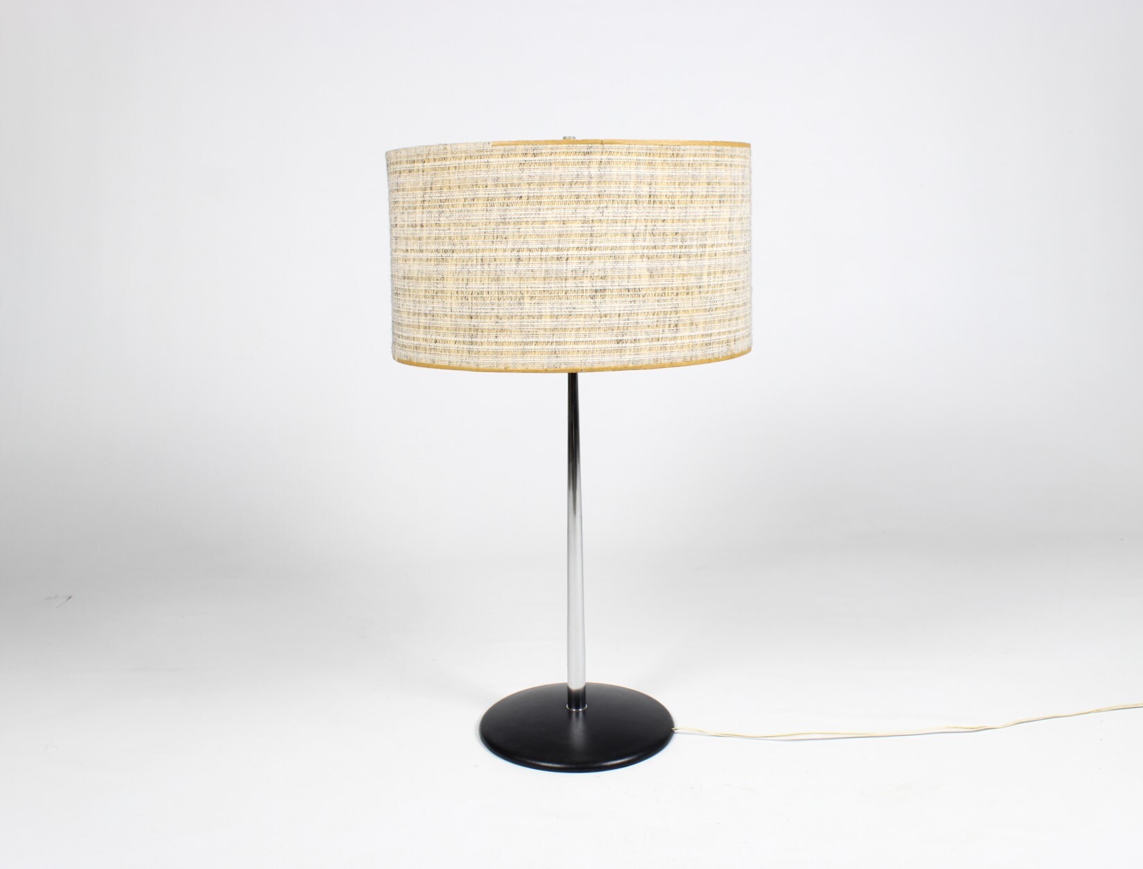 Een vintage tafel- of bureaulamp met een lampenkap uit textielweefsel. Een zwarte voet die bekleed is met similileder/skaï. De verchroomde staaf wordt dunner naar boven toe hetgeen een verslankend effect heeft. Drie lichtpunten en 2 schakelaars, men kan kiezen om slechts 1 lamp, 2 of 3 lampen te laten branden.